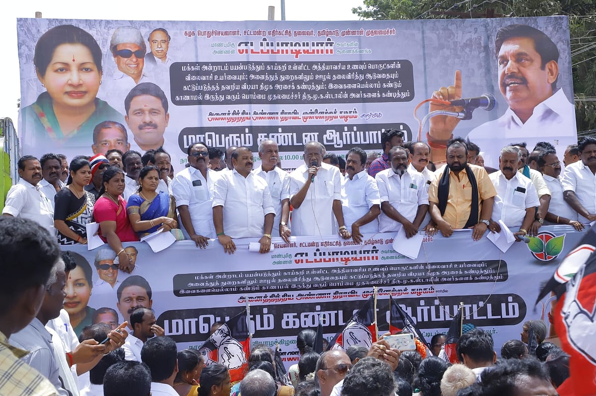 “காய்கறி உள்ளிட்ட மக்கள் அன்றாடம் பயன்படுத்தக்கூடிய உணவுப் பொருள்களின் விலைவாசி உயர்வு, அனைத்து துறைகளிலும் தலைவிரித்தாடும் ஊழல் உள்ளிட்டவற்றைக் கட்டுப்படுத்தத் தவறிய தி.மு.க அரசையும், இவற்றைக் கண்டும் காணாமல் இருக்கும் முதலமைச்சர் ஸ்டாலினைக் கண்டித்தும் 20-ம் தேதி (இன்று) தமிழகம் முழுவதும் அ.தி.மு.க சார்பில் ஆர்ப்பாட்டம் நடைபெறும்” என முன்னதாக எடப்பாடி பழனிசாமி அறிவித்திருந்தார். அதன்படி இன்று மாநிலம் முழுவதும் அந்தக் கட்சியினர் ஆர்ப்பாட்டம் நடத்தினர். அந்த வகையில் தஞ்சாவூரில் கண்டன ஆர்ப்பாட்டம் நடைபெற்றது. அதில் அ.தி.மு.க முன்னாள் அமைச்சர் ப.மோகன் கலந்துகொண்டார்.