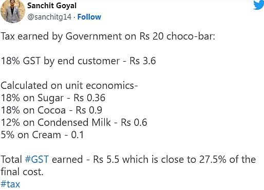 இன்னொரு பதிவில் அடிப்படை பொருட்களில் இருந்து அரசு எவ்வாறு ஜி.எஸ்.டி பெறுகிறது என்பதைத் தெளிவாகக் குறிப்பிட்டு இருந்தார். அதில் பொருளாதார கணக்கின்படி, “20 ரூபாய் சாக்கோ பாரில், மொத்தமாக 5.5 ரூபாய் ஜி.எஸ்.டி பெறப்படுகிறது. இது பொருளின் இறுதி விலையின் 27.5 சதவிகிதத்திற்குச் சமம்” என குறிப்பிட்டு இருந்தார்.