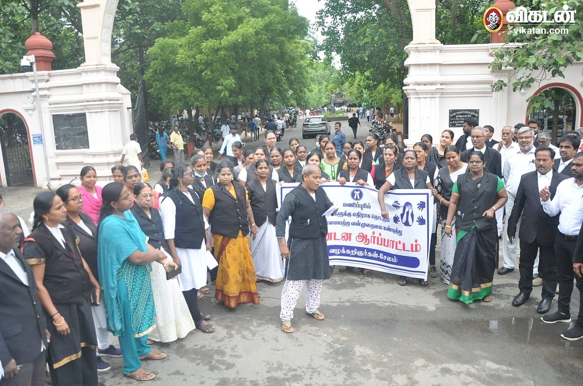 மணிப்பூர் மாநில முதல்வர் பதவி விலக வலியுறுத்தி, சேலம் ஒருங்கிணைந்த மாவட்ட நீதிமன்ற வளாகம் முன்பு பெண் வழக்கறிஞர்கள் கண்டன ஆர்ப்பாட்டம் நடத்தினர்.