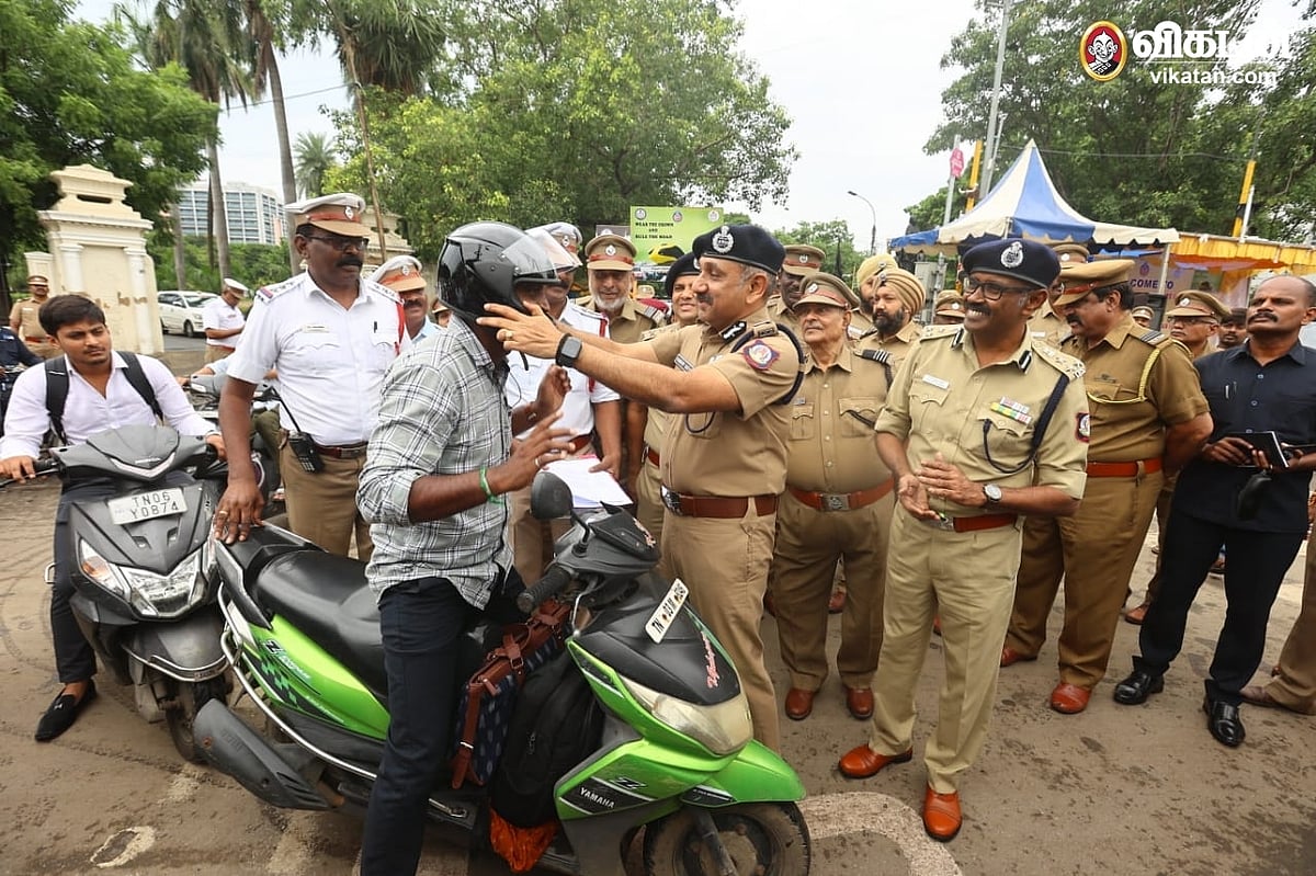 மாணவர்களுடன் சாலைப் பாதுகாப்பு விழிப்புணர்வு நிகழ்ச்சியில், சென்னை பெருநகரக் காவல் ஆணையாளர் சந்தீப் ராய் ரத்தோர், தலைக்கவசம் அணியாமல் வந்தவர்களுக்கு தலைக்கவசம் அணிவித்து அறிவுரை கூறினார்.