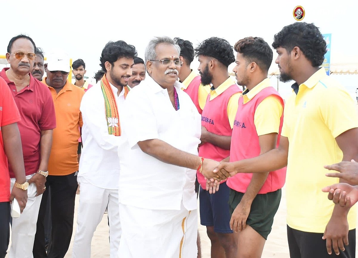 புதுச்சேரி, புதுக்குப்பம் பகுதியில், `சான்ட் டியூன்ஸ்’ கடற்கரையில் நடைபெறும் மாநில அளவிலான ஐவர் கடற்கரை கால்பந்து போட்டிகளை சபாநாயகர் செல்வம் தொடங்கிவைத்தார்.கடலூர்: