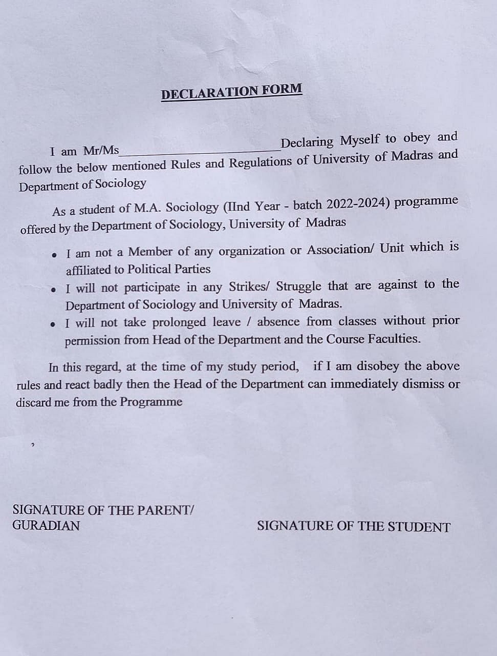 இப்படிப்பட்ட சென்னை பல்கலைக்கழகத்தில்தான் சத்தமே இல்லாமல் ஒரு சர்ச்சை வெடித்திருக்கிறது. முதுநிலை சமூகவியல் 2-ம் ஆண்டு படிக்கும் மாணவர்களுக்கு அவர்களின் துறை சார்பில், சமீபத்தில் ஒப்புதல் படிவம் ஒன்று வழங்கப்பட்டது. அதில், `நான் அரசியல் கட்சிகள் சார்ந்த எந்தவொரு அமைப்பு மற்றும் சங்கங்களில் உறுப்பினராக இல்லை. சென்னை பல்கலைக்கழகத்துக்கு எதிராக எந்தப் போராட்டத்திலும் பங்கேற்கமாட்டேன். முன் அனுமதியின்றி நீண்டகால விடுப்பு, வகுப்புக்கு வராமல் இருக்கமாட்டேன்’ ஆகியவைக் குறிப்பிடப்பட்டிருக்கின்றன. இதற்கு மாணவர்கள் மற்றும் அவர்களின் பெற்றோர்கள் ஒப்புதல் அளித்து கையொப்பமிட வேண்டும் என்றும் தெரிவிக்கப்பட்டிருக்கிறது. மேலும், மாணவர்கள் தாங்கள் படிக்கும் காலத்தில் இந்த விதிகளை மீறினால், துறைத்தலைவர் தங்களை உடனே படிப்பிலிருந்து நீக்கலாம் என்றும் அதில் குறிப்பிடப்பட்டிருந்திருக்கிறது. இந்த விவகாரம் சமூக வலைதளங்களில் பரவி, சர்ச்சையாகியிருக்கிறது.