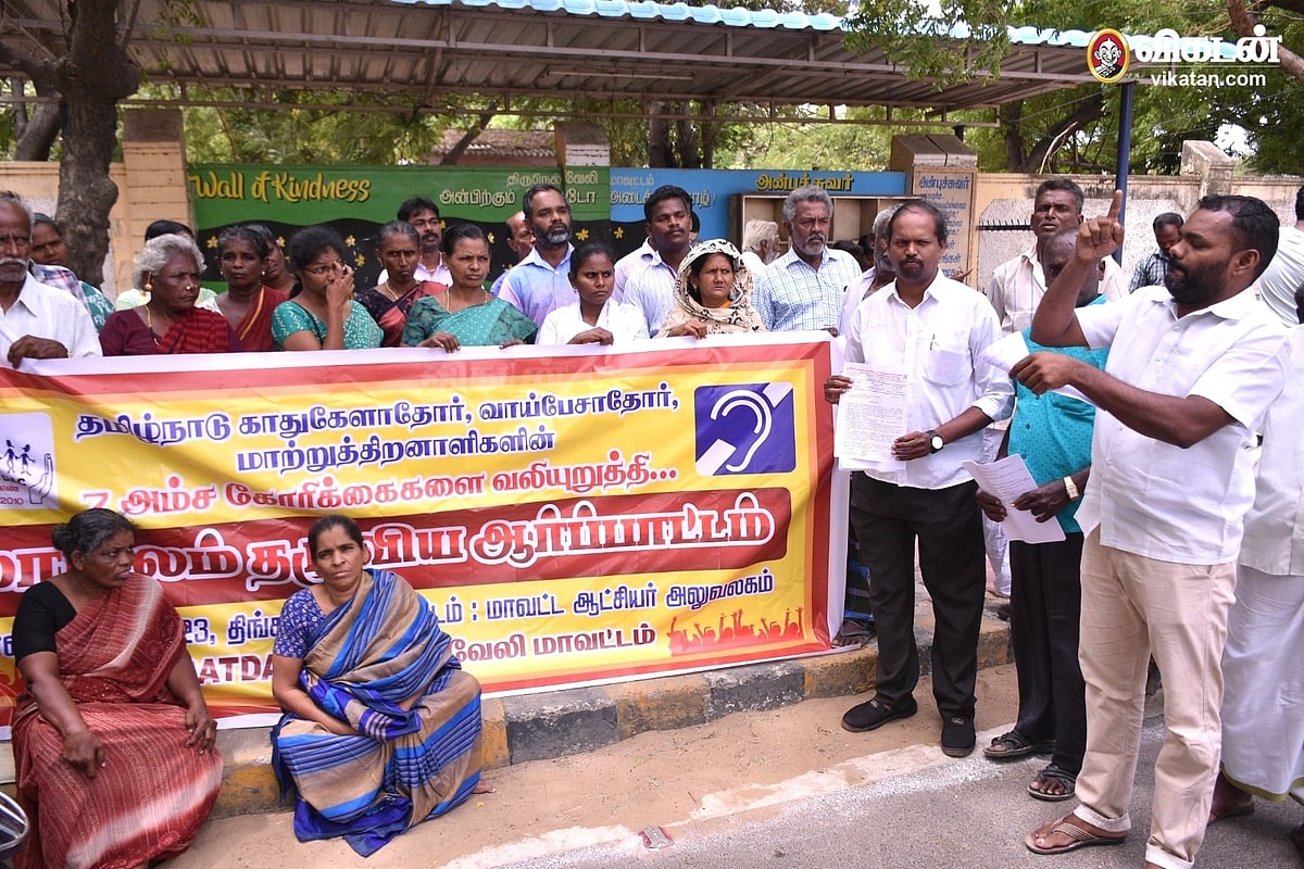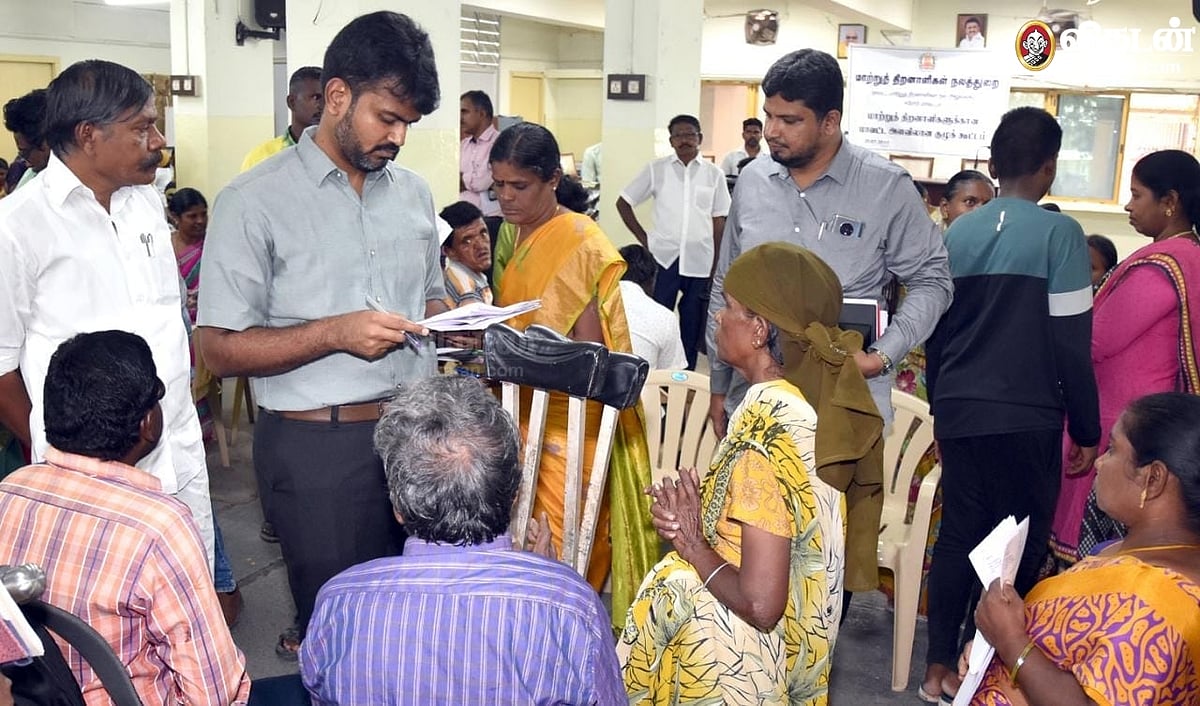 7 அம்ச கோரிக்கைகளை வலியுறுத்தி, மாவட்ட ஆட்சியரிடம் மனு அளிக்க வந்த மாற்றுத்திறனாளிகள்.