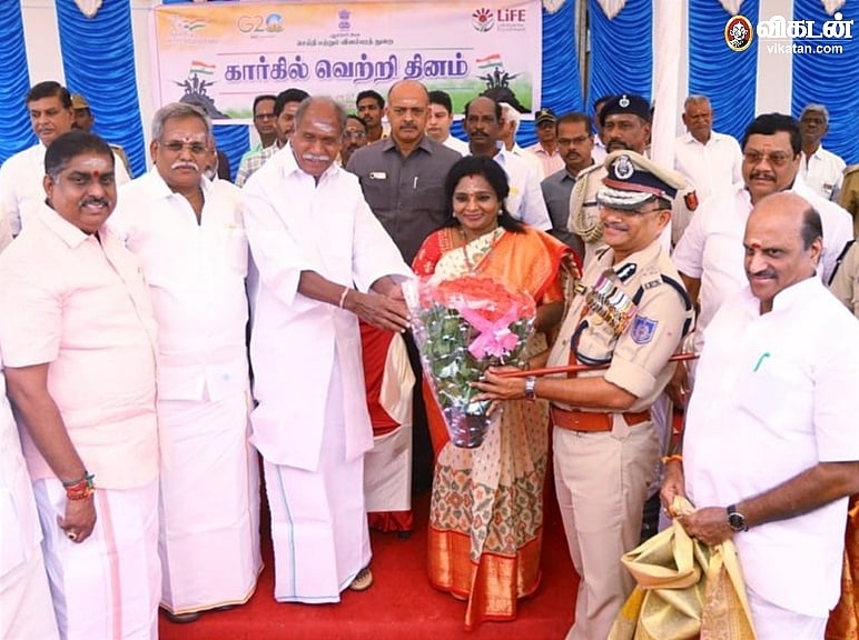 கார்கில் போரில் இந்திய வீரர்களுக்கு உதவிய புதுச்சேரி டி.ஜி.பி. ஸ்ரீனிவாஸை, கவர்னர் தமிழிசை மற்றும் முதல்வர் ரங்கசாமி பாராட்டினர்.