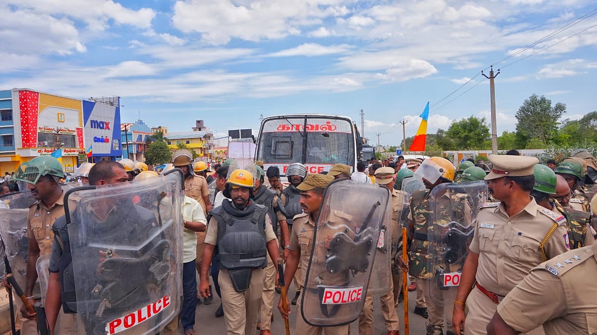 அதற்காக இன்று காலை 10 மாவட்டங்களைச் சேர்ந்த சுமார் 2,000 போலீஸார் நெய்வேலியில் குவிக்கப்பட்டனர். அத்துடன் நெய்வேலி நுழைவு வாயிலை சீல் வைத்ததுடன், வஜ்ரா வாகனங்களும் தயாராக நிறுத்தப்பட்டிருந்தன. அதையடுத்து மதியம் 12 மணியளவில் போராட்ட மேடைக்கு வந்த அன்புமணி ராமதாஸ், “தனியாருக்கு விற்கப்பட இருக்கும் என்.எல்.சிக்காக தமிழக அரசு ஏன் நிலங்களை கையகப்படுத்தி கொடுக்க வேண்டும் ? அது அரசின் வேலை கிடையாது. மீண்டும் தமிழக அரசை எச்சரிக்கிறோம். நிறுத்திக்கொள்ளங்கள். இனி ஒரு பிடி மண்ணைக் கூட கையகப்படுத்தக் கூடாது. இதுவரை கையகப்படுத்திய நிலங்களை மீண்டும் விவசாயிகளிடம் ஒப்படையுங்கள்” என்று பேசிவிட்டு கீழே இறங்கியவர், தொண்டர்களுடன் என்.எல்.சி அலுவலகத்திற்குள் தடையை மீறி நுழைய முயற்சி செய்தார்.