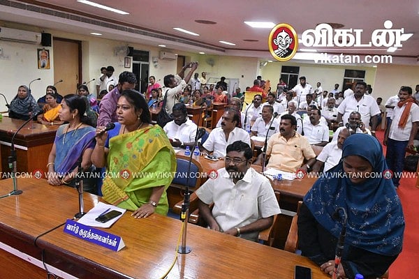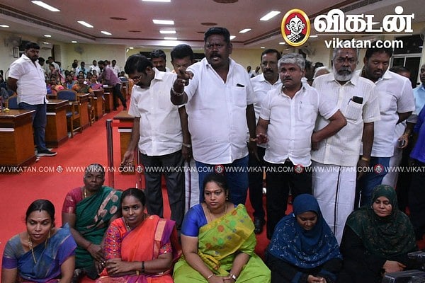 பெண் கவுன்சிலர்களின் குற்றச்சாட்டால் மாநகராட்சி அரங்கத்தில் சலசலப்பு ஏற்பட்டது. அப்போது, ’கட்சி விவகாரங்களை மாநகராட்சிக் கூட்டத்தில் பேச வேண்டாம்’ என ஆணையர் சிவகிருஷ்ணமூர்த்தி கேட்டுக் கொண்டபோதிலும், பெண் கவுன்சிலர்கள், `எங்கள் உயிர்ப் பிரச்னையை எங்கு போய் சொல்ல வேண்டும்?’ என பதில் கேள்வி கேட்டபடி… தரையில் அமர்ந்து தர்ணா போராட்டத்தில் ஈடுபட்டனர்.